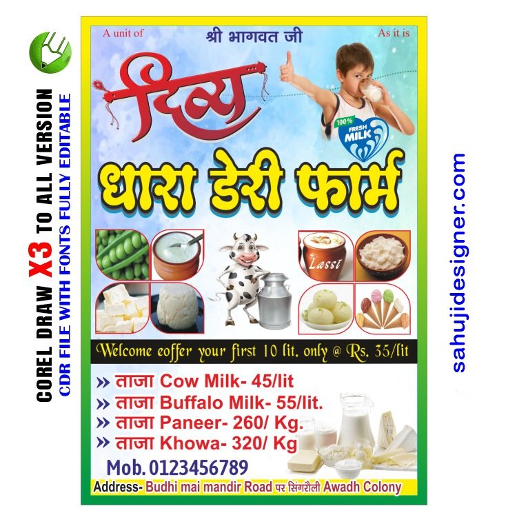 Dudh dairy banner design Using CorelDRAW, for a dairy is simple. Launch CorelDRAW and start a new document , is Use images of cows, milk bottles, cheese, or other dairy items, together with text marketing your dairy products. Make use of CorelDRAW’s capabilities for accurate design and layout. Save your work in CDR format so that sharing and editing will be simple. And that’s it! Using CorelDRAW, you have made a banner for dairy.
