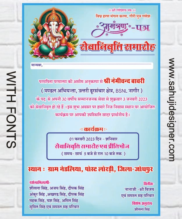 Easily edit name, date, venue, and message details in CorelDRAW X5 or higher versions and design a beautiful Seva Nirvritti Samaroh Amantran Patra within minutes!